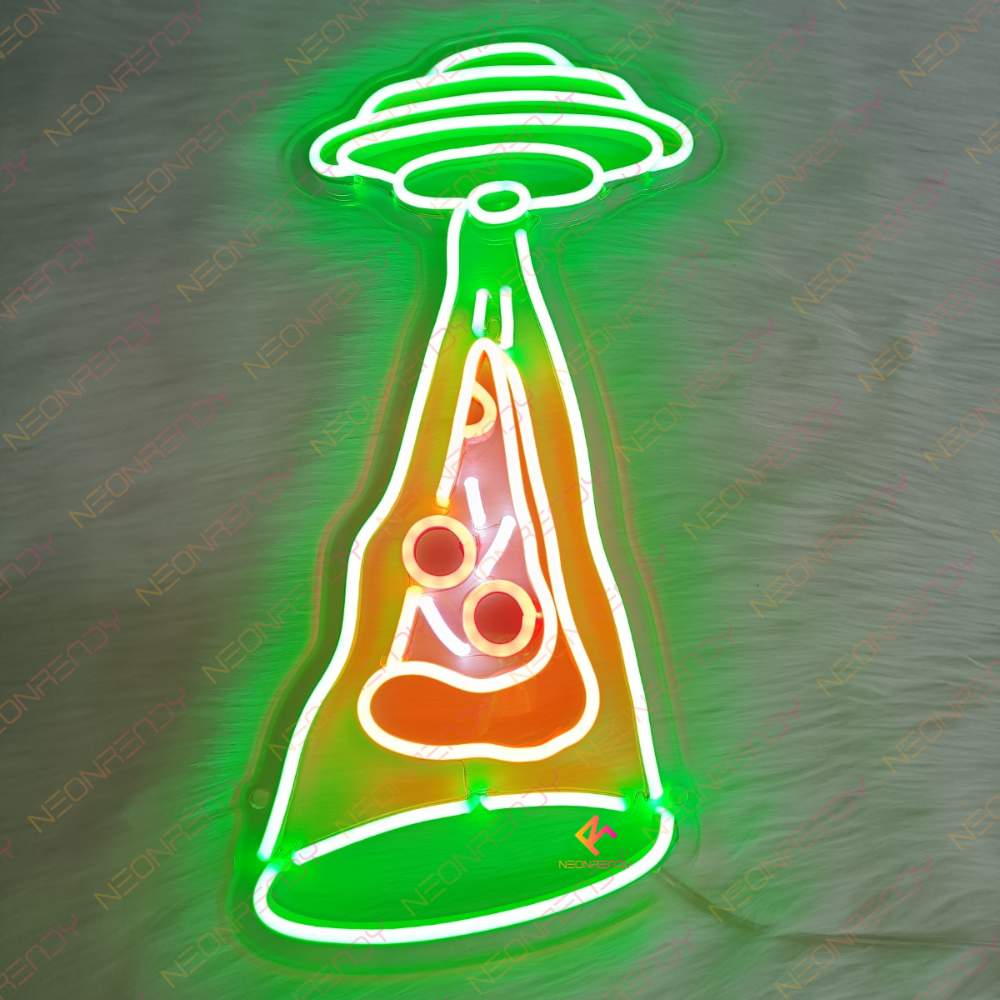 Imagine a neon sign featuring a pizza as the centerpiece of a spaceship, symbolizing the culinary adventure your establishment offers. This eye-catching pizza slice sign not only celebrates the love for pizza but also invites patrons to embark on a flavor journey like no other.